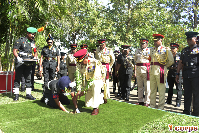 In line with the 1 Corps Day Celebrations on 17 October 2025, a ceremonial Guard Turnout was respectfully presented to Major General KHMS Wickramarathne RSP, the Commander of 1 Corps, by the troops of 8th Regiment of Sri Lanka Artillery. Subsequently, the Commander posed for a group photograph with Officers and Other Ranks. To commemorate this significant milestone, the Commander of 1 Corps ceremonially planted a Sandalwood sapling within the premises of the headquarters complex, marking the occasion with a gesture of remembrance and growth, followed by a formal troop address, during which he appreciated their dedication, discipline, and unwavering commitment to duty. The series of anniversary commemorative events culminated with a cordial fellowship among all ranks, held in the evening, symbolizing unity and camaraderie within the 1 Corps.