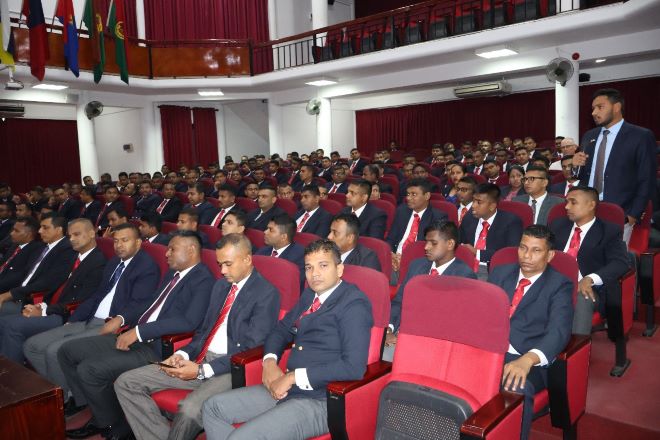 The speech, titled ‘The Great Power Competition in the Indian Ocean and its Impact on Small Island States in the Indian Ocean’, captivated an audience of 125 officers who are following the Senior Command Course - 14, Junior Command Course - 33, and Junior Staff Course -29 together with the Commandant, Deputy Commandant and the members of the faculty and the permanent staff.