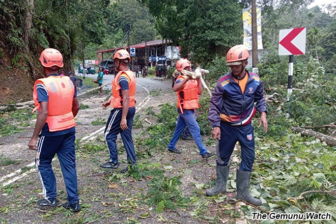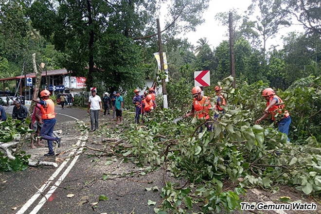 Due to adverse wind conditions, several trees were found dangerously leaning onto the roadway at the 51 Junction near the Deniyaya Police Station, posing a risk to commuters and nearby residents.