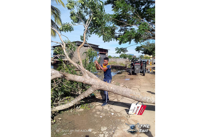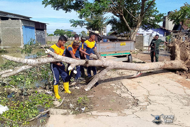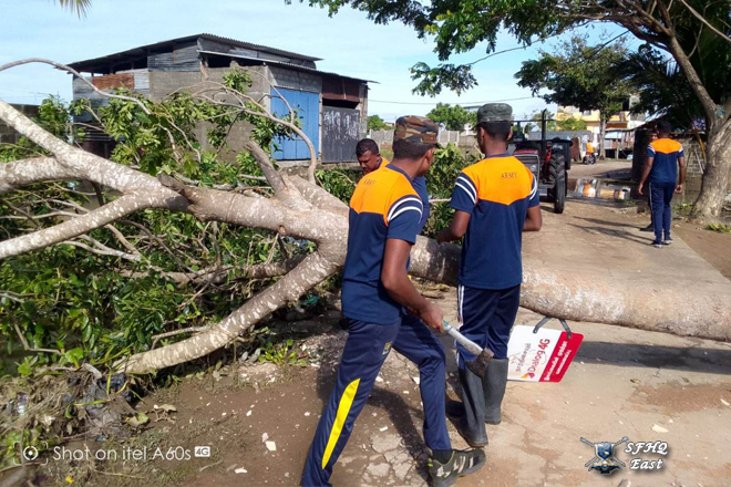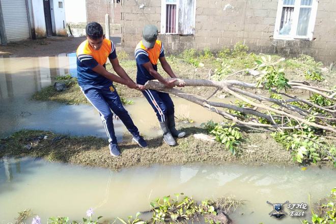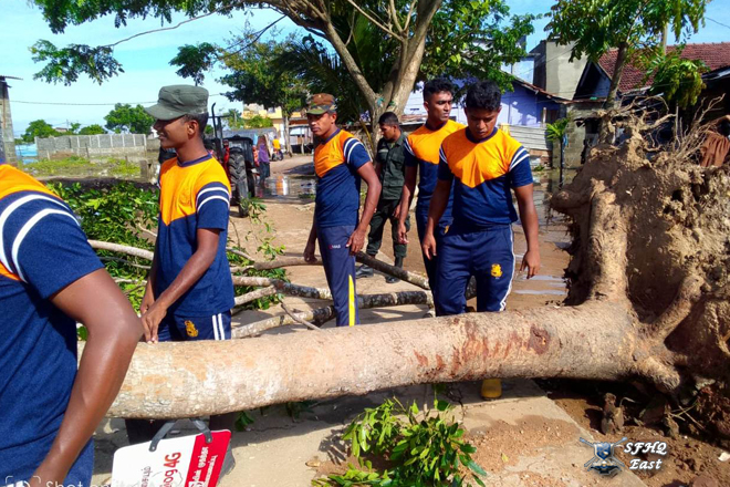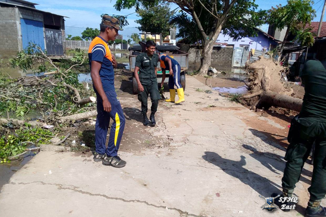 Under the guidance of the General Officer Commanding, 24 Infantry Division, Major General K.W. Jayaweera USP, psc, 1x12 troops from the 11 (V) Sinha Regiment actively assisted in removing a tree that had fallen on a building of Sinhala Maha Vidyalaya, Batticaloa. The tree was brought down by heavy rains affecting the area under the 24 Infantry Division, which is under the control of SFHQ (E).