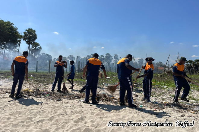 Under the 513 Infantry Brigade, while adverse weather conditions persisted, troops of the 11 Sri Lanka Light Infantry extended essential assistance to flood affected communities in the Karainagar area by conducting road clearing operations, including the removal of uprooted trees and obstructions, to restore accessibility and ensure public safety within the brigade area of responsibility. Simultaneously, troops of the 10 Sri Lanka Artillery operating in challenging weather conditions supported coastal community recovery efforts by assisting local residents in the cleaning and restoration of Wasanthakulam beach, contributing to environmental rehabilitation and public wellbeing.