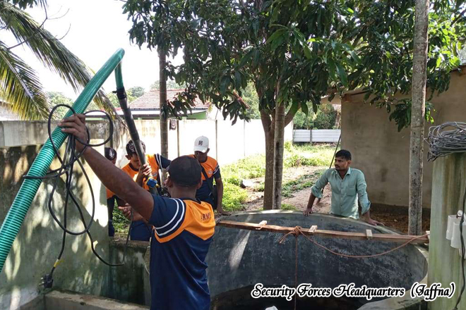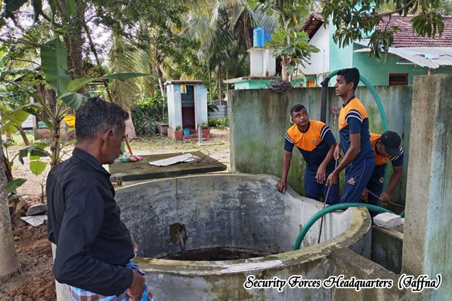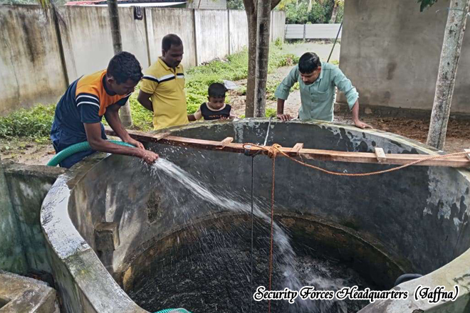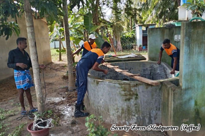 Furthermore, with the participation of 01 officer with 08 soldiers from the Sri Lanka Light Infantry Regiment, a drinking water well in the Anandapuram (East) area of Kilinochchi, which had become contaminated due to flooding, was cleaned and restored for public use.