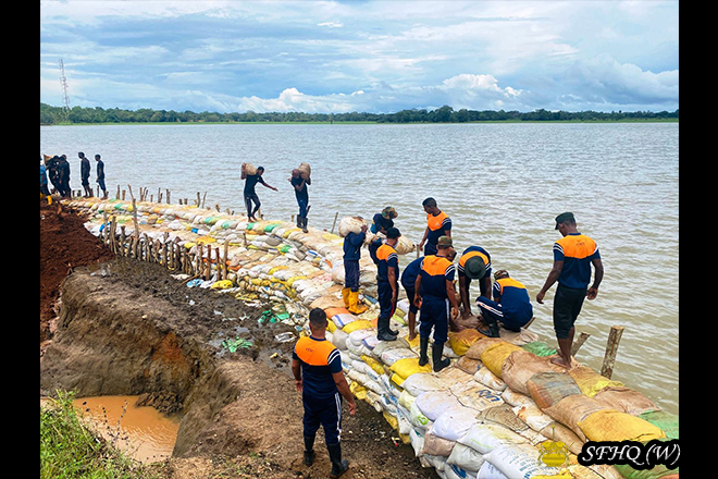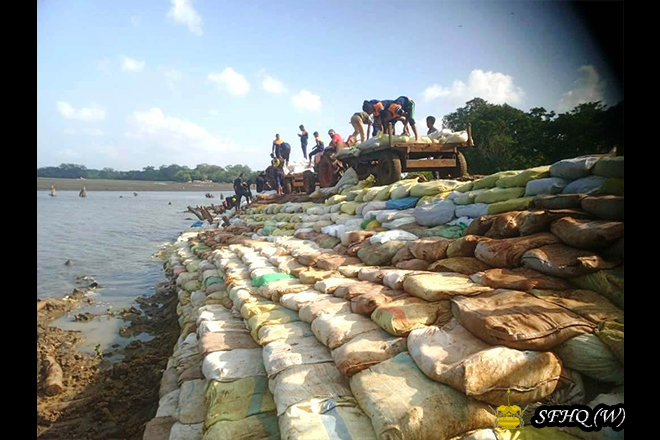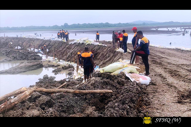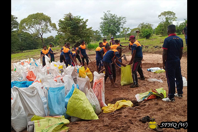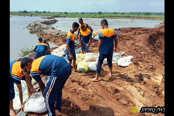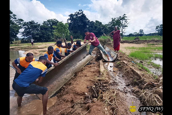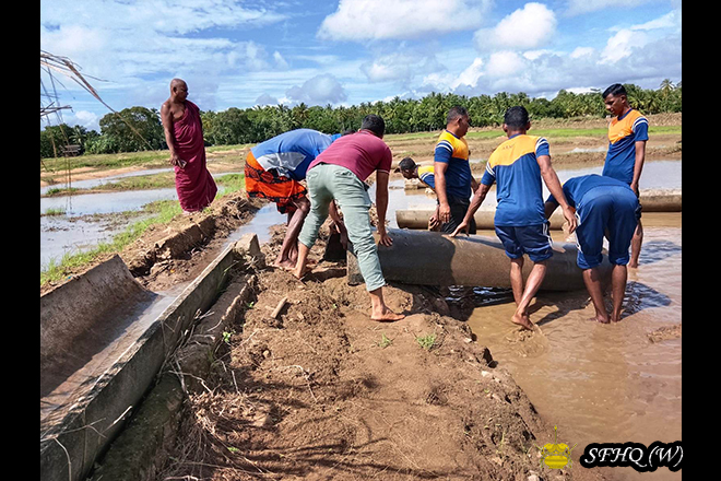 Accordingly, with the objective of restoring normal civilian life, and under the guidance of the Commander, 213 Infantry Brigade, Brigadier B N S B Rangama RSP USP psc, and the direct supervision of the Commanding Officers of the 2 (V) Vijayabahu Infantry Regiment and the 5th Sri Lanka National Guard, repair work to the breached bunds of the Muwa Aetagama, Kokpattiyawa, Bellankadawala, and Thuppitiyawa tanks—belonging to the Divisional Secretariat Divisions of Medawachchiya, Mahavilachchiya, and Nuwaragam Palatha Central—was successfully carried out on 16 December 2025. These repairs were conducted by laying sandbags, with manpower contributed by troops of the respective units.
