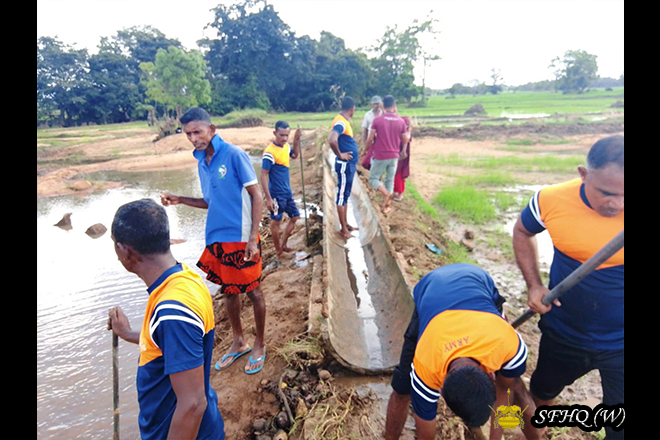 Accordingly, 01 x 10 troops of the 7 (V) Sri Lanka Armoured Corps, together with local villagers, repaired a damaged irrigation canal at Weli Ela village, Palugaswewa, using concrete pipes.