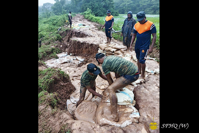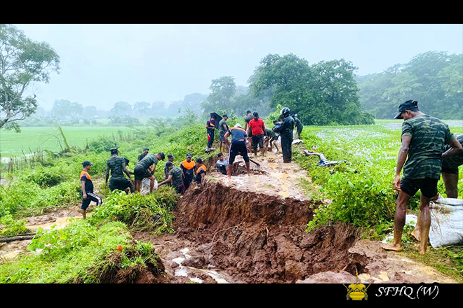 Due to the prevailing heavy rainfall this morning, a section of the Purawanar Kulam tank bund sustained damage. In response, the Commander of the 562 Infantry Brigade, Brigadier D M P U Dissanayaka RSP USP IG, tasked the 12 (V) Vijayabahu Infantry Regiment troops with carrying out urgent repair work on the affected bund.