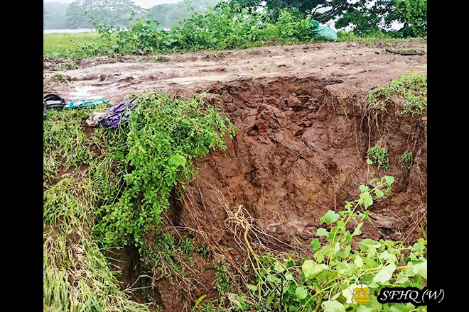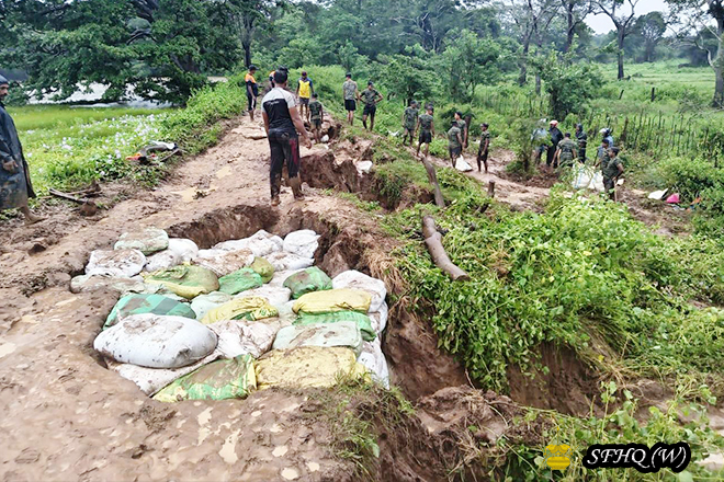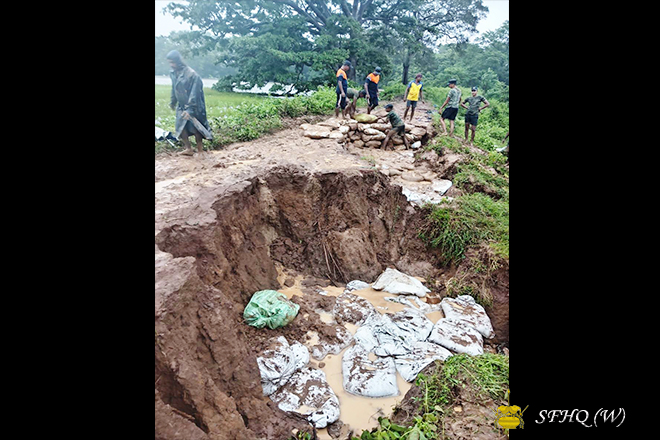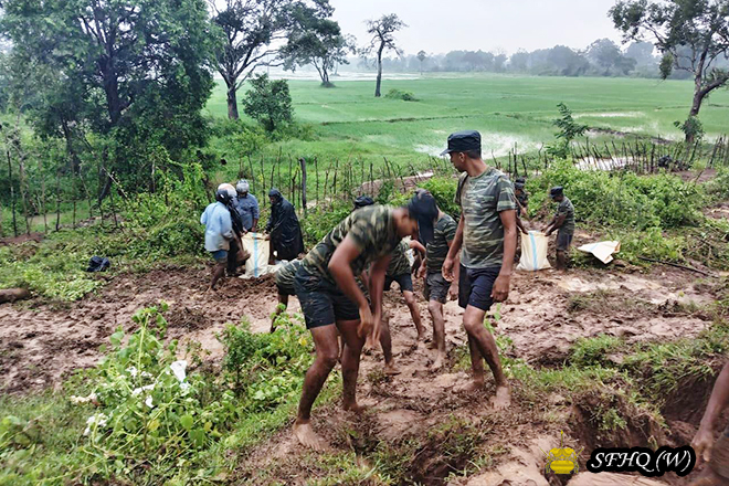 A team of 03 x 40 troops from 12 (V) VIR was promptly deployed to reinforce the damaged section using sandbags, preventing a potential overflow that could have caused flooding in the surrounding area. The operation was carried out at Grid Reference 538957