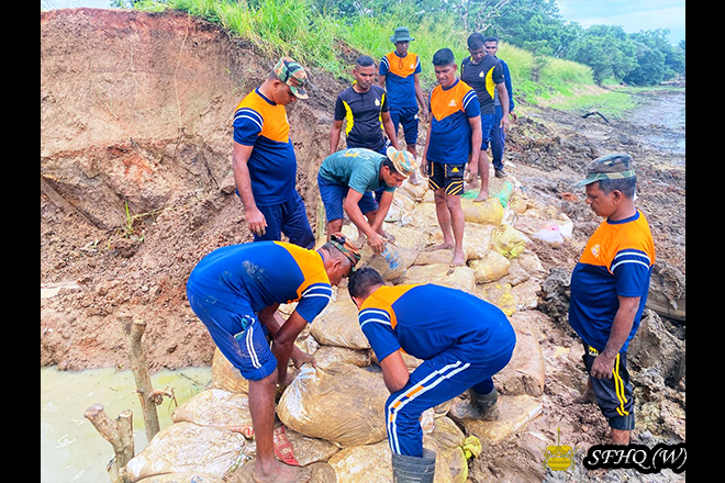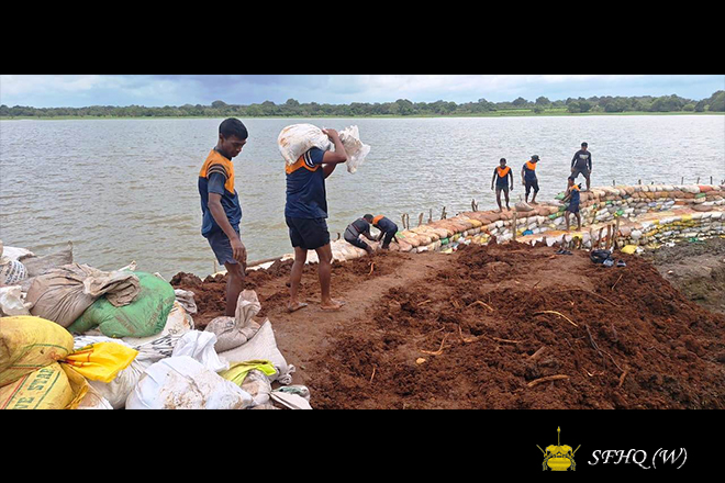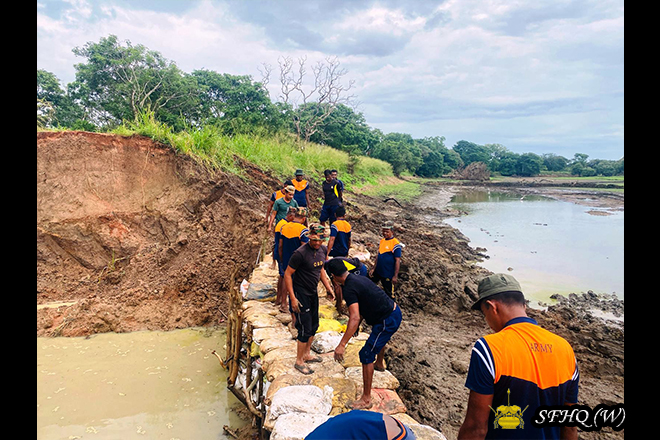 Under the 213 Infantry Brigade, several areas were impacted by adverse weather conditions within the Brigade’s area of responsibility. Accordingly, with the objective of restoring civilian livelihoods, and on the instructions of the Commander of the 21 Infantry Division, under the supervision of the Commander, 213 Infantry Brigade, Brigadier B N S B Rangama RSP USP psc, and the direct supervision of the Commanding Officers of the 2 (V) Vijayabahu Infantry Regiment and the 5th Sri Lanka National Guard, repair work was carried out on 17 December 2025. Breached bunds of the Kokpatiyawa, Bellankadawala, Mahalidawawa, Madadeniyagama, and Siyabalagasweva tanks, located within the Medawachchiya, Nochchiyagama, Mahavilachchiya, and Central Nuwara District Divisional Secretariat divisions, were restored by laying sandbags with the labour contribution of the respective troops.