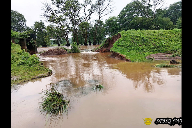 A team of 02×25 troops from 12 (V) VIR, together with 15 villagers, assisted in reinforcing the damaged section by installing sandbags to control the water overflow and stabilize the embankment.