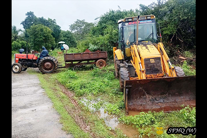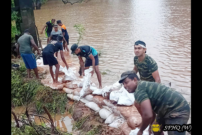The tank bund of Kurisudda Kulam, located at Grid Reference 614018, was damaged by approximately 25 feet due to continuous heavy rainfall. Troops of the 12 (V) Vijayabahu Infantry Regiment promptly undertook restoration work to prevent further deterioration.