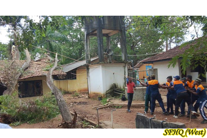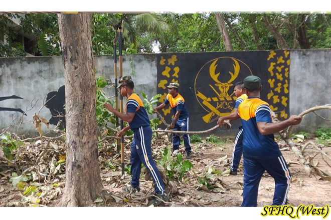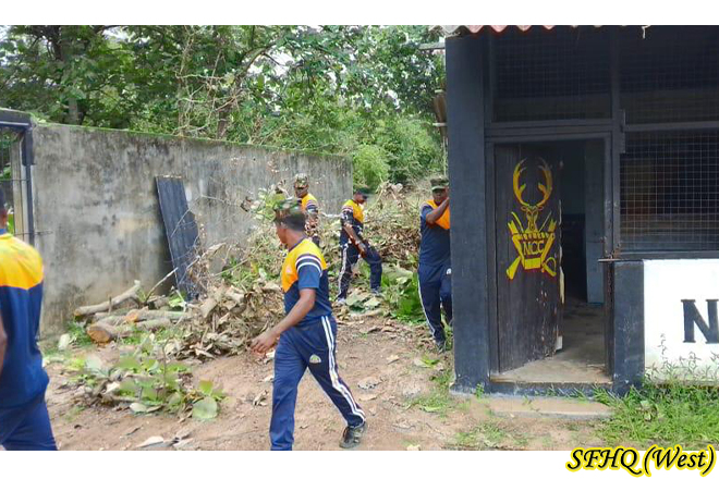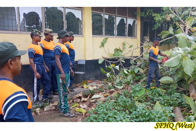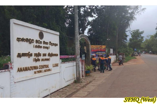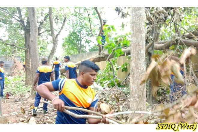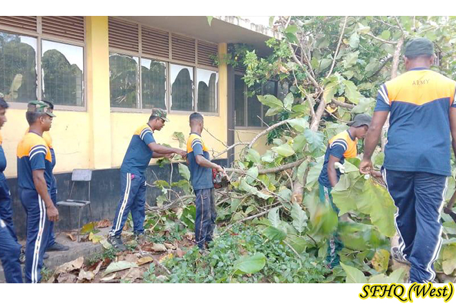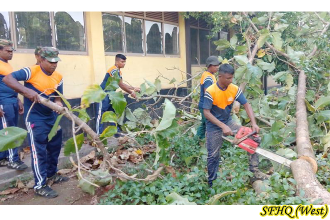 Troops of the 11 Sri Lanka National Guard carried out a clearing operation at Anamaduwa Central College, which had suffered significant damage due to fallen trees. The team promptly cut down and removed the obstructing trees, ensuring the safety of the school premises. Their efforts helped restore normalcy and prepare the environment for the resumption of educational activities.