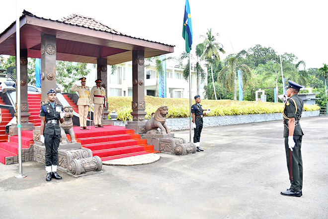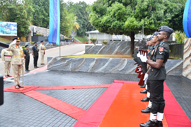 The arriving Senior Officer was warmly welcomed by Brigadier RC Wijekoon USP psc, Centre Commandant of SLSC and was greeted with a Guard Turnout at the main entrance. Subsequently, he was invited to pay a floral tribute to the SLSC War Heroes' Monument and was ushered to the parade square to receive the honour of a ceremonial parade presented by the SLSC troops.