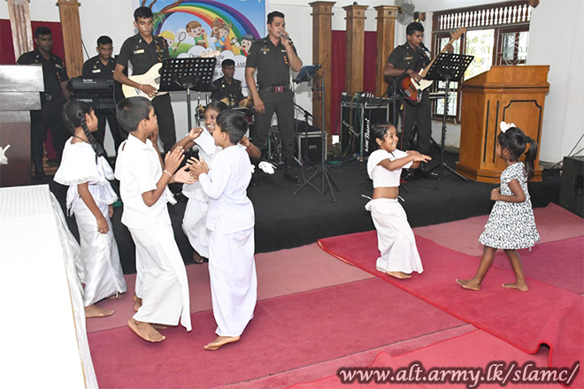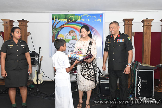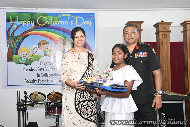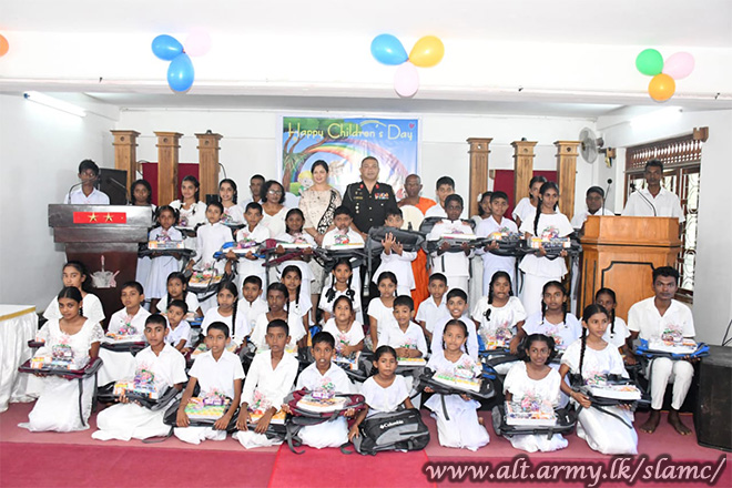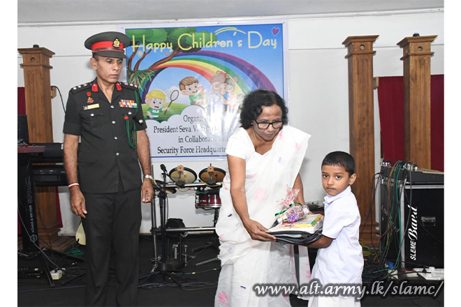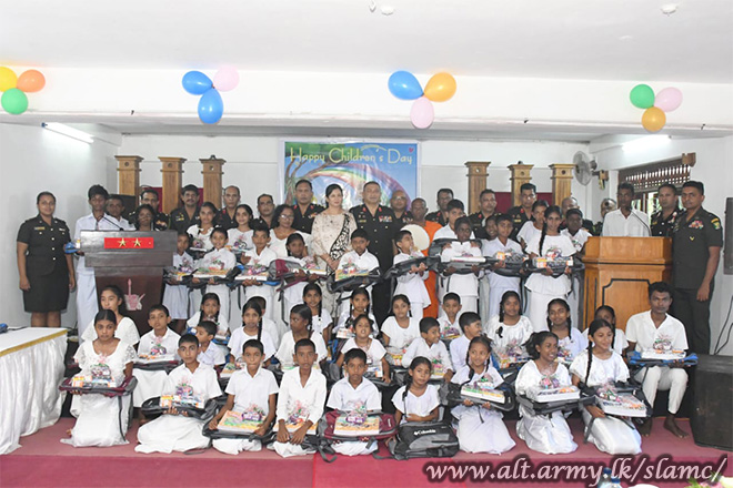 In celebration of World Children's Day 2025, Mrs. Anushani Kulatunga, the President Seva Vanitha Branch of the Sri Lanka Army Medical Corps along with Commander Security Forces (Wanni) organized a special event featuring the distribution of most needed school stationery program and a musical performance for 47 children at Atambagaskada National Mix School in Vavuniya. Mrs. Anushani Kulatunga, the President of the Seva Vanitha Branch of the Sri Lanka Army Medical Corps graced the occasion as the Chief Guest together with Major General K M P S B Kulatunga RSP ndc psc, the Commander of the Security Force Headquarters (Wanni) and Colonel Commandant of the Sri Lanka Army Medical Corps and they were warmly received by two children, who greeted them with a traditional offering of a sheaf of betel leaves.