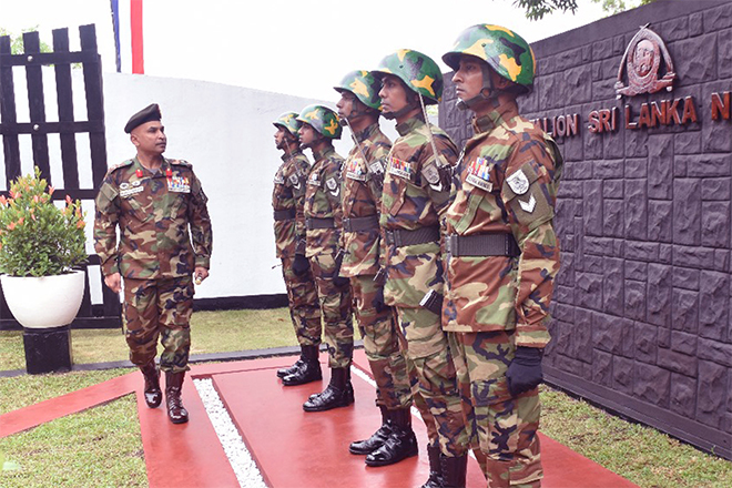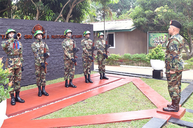 In accordance with the scheduled itinerary, the visit commenced with an inspection of the 16 Sri Lanka National Guard (16 SLNG) and followed by a visit to the 11 Volunteer (Battalion) Sri Lanka Sinha Regiment (11 (V) SLSR).