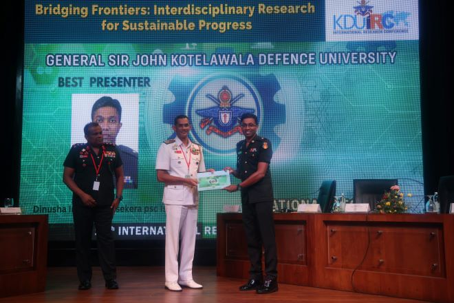 Major Dinusha Jayasekara psc Isc, currently serving at the Army War College as DS, accomplished an excellent achievement by winning the Best Research Paper Award in the National Security category during Technical Session V at the 18th International Research Conference conducted by General Sir John Kotelawala Defence University.