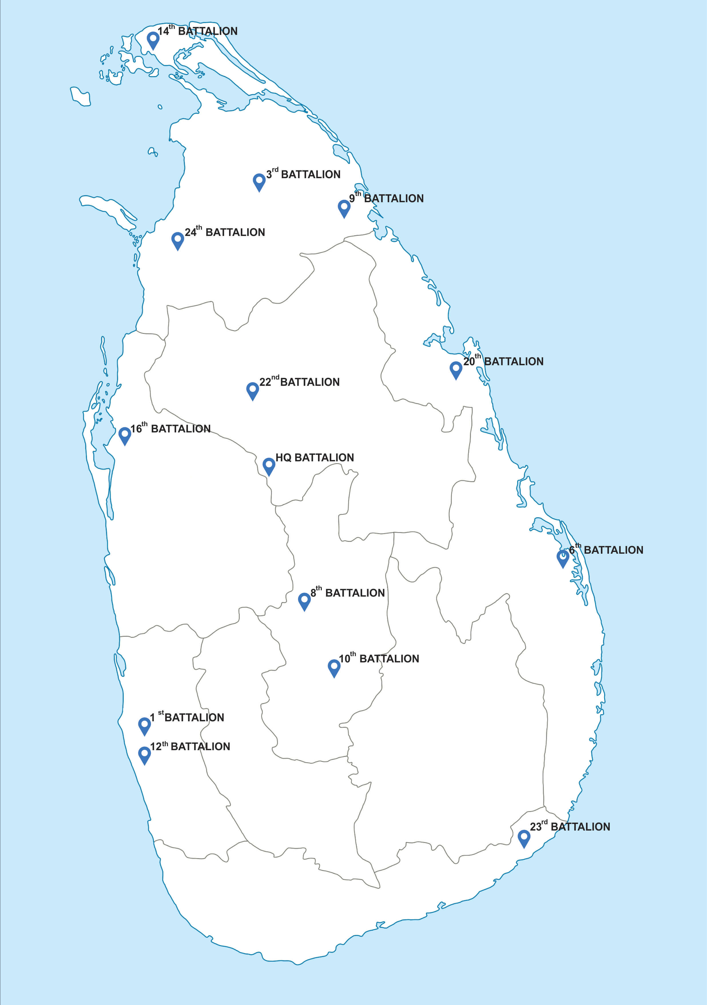 බළඇණිය ස්ථානගත ප්රදේශය 1. 1 වන බලඇණිය ගජබා රෙජිමේන්තුව දේවහුව 2. 3 වන බලඇණිය ගජබා රෙජිමේන්තුව මාන්කුලම් 3. 4 වන බලඇණිය ගජබා රෙජිමේන්තුව මඩු 4. 6 වන බලඇණිය ගජබා රෙජිමේන්තුව මට්ටක්කුලිය 5. 8 වන බලඇණිය ගජබා රෙජිමේන්තුව උකුවෙල - මාතලේ 6. 9 වන බලඇණිය ගජබා රෙජිමේන්තුව නෙළුම්වැව 7. 10 වන බලඇණිය ගජබා රෙජිමේන්තුව නුවර 8. 12 වන බලඇණිය ගජබා රෙජිමේන්තුව පලටුපාන - යාල 9. 14 වන බලඇණිය ගජබා රෙජිමේන්තුව යාපනය 10. 16 වන බලඇණිය ගජබා රෙජිමේන්තුව පුත්තලම 11. 20 වන බලඇණිය ගජබා රෙජිමේන්තුව පුල්මුඩේ 12. 22 වන බලඇණිය ගජබා රෙජිමේන්තුව සාලියපුර - අනුරාධපුර 13. 23 වන බලඇණිය ගජබා රෙජිමේන්තුව මෙම ඒකකය 2023 ජුලි මස 23 වන දින විසුරුවා හරින ලදි. 14. 24 වන බලඇණිය ගජබා රෙජිමේන්තුව 2022 නොවැම්බර් මස 23 වන දින සිට 4 වන බළඇණිය ගජබා රෙජිමේන්තුව වශයෙන් නාමිකව ප්රකාශයට පත්කරන ලදි. 15. රෙජිමේන්තු මුලස්ථාන බළඇණිය ගජබා රෙජිමේන්තුව සේනපුර