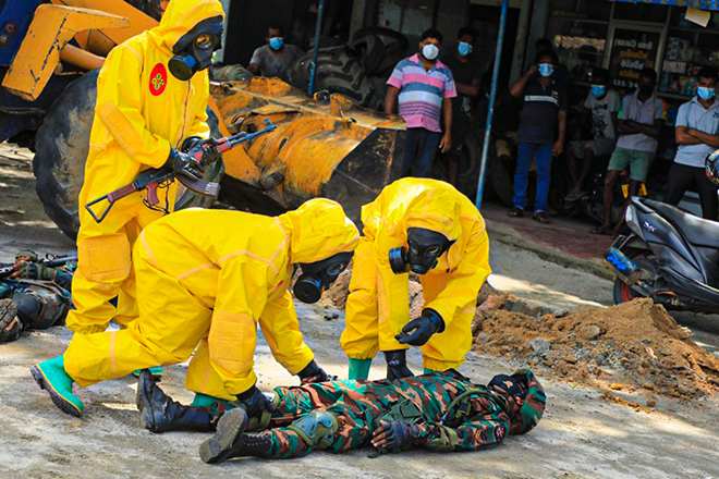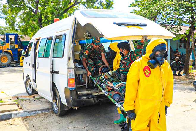 The exercise 'Mithra Shakti' is being conducted with the blessings of the Chief of Defence Staff and Commander of the Army, General Shavendra Silva, General Officer Commanding, 53 Division, Major General Nishantha Manage functions as the Exercise Director. All field engineer and CBRN tasks were carried out under the guidance of the Chief Field Engineer, Major General Nihal Amarasekara by the Commanding Officer and his troop of 14 CBRN Response Regiment SLE. The Commanding Officer, Lt Col Danushka Liyanage functions as an Engineer/CBRN coordinator/observer for the Exercise.