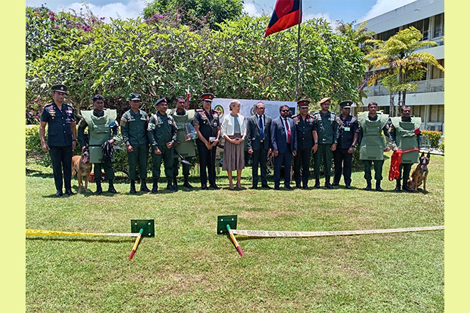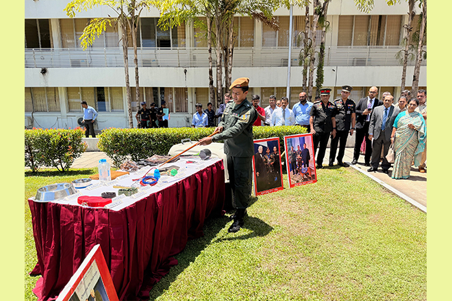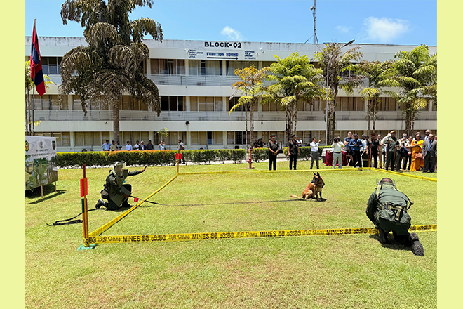 Apart from the Exhibition conducted by NGOs, a Mine Detection Dogs (MDDs) demonstration was organized by Corps of Sri Lanka Engineers K9 Unit along with an informative briefing, highly trained MDDs showcased their critical role in ensuring safety during demining operations. The Demonstration emphasizes the effectiveness, precision, and discipline of these specialized dogs in detecting landmines and unexploded ordnance. Upon detecting the scent of explosives, the dogs showing their handlers without making physical contact with the devices showcasing their training in safely identifying hidden threats was highlighted.