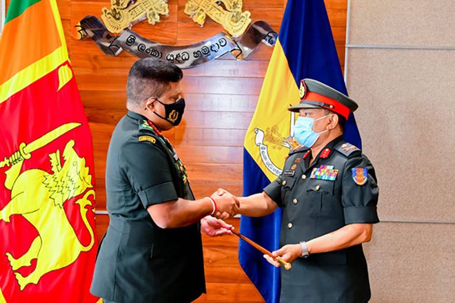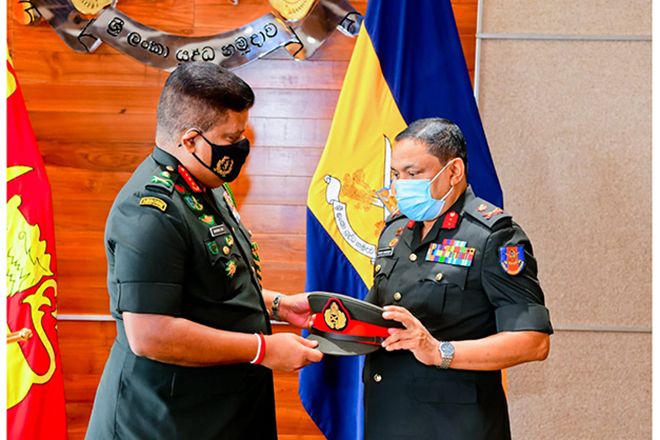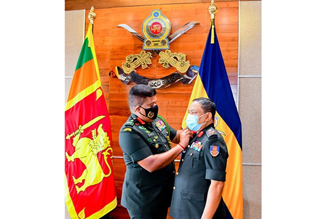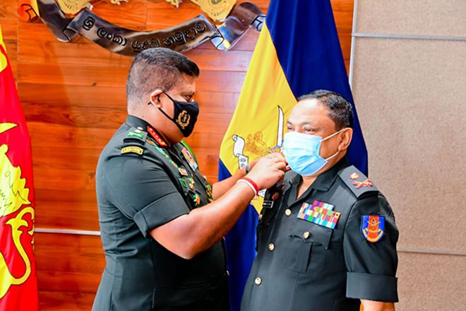 Just-promoted Major General Chandana Wijesundera received his new insignia from the Chief of Defence Staff and Commander of the Army, Lieutenant General Shavendra Silva adding memories to their career at the Commander’s office in the Army Headquarters on 03 November 2020.