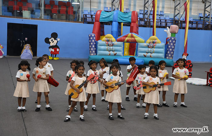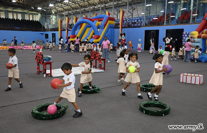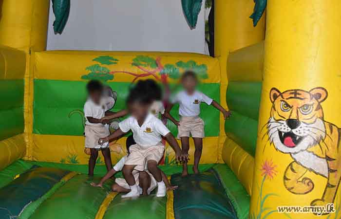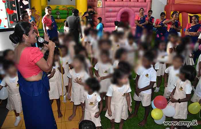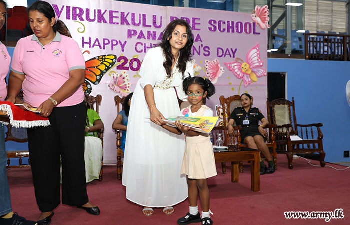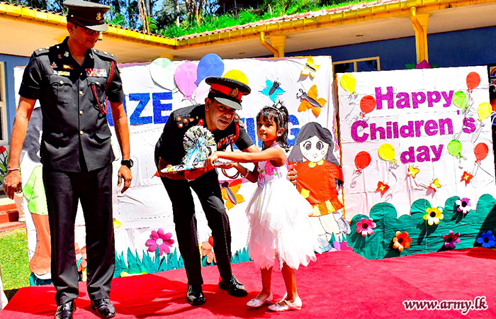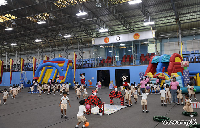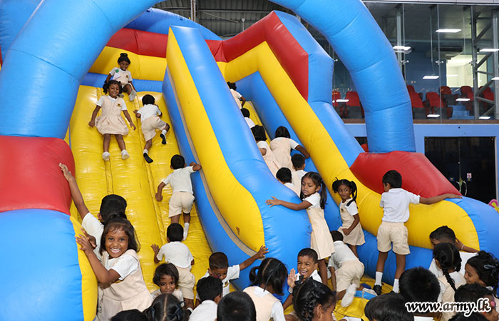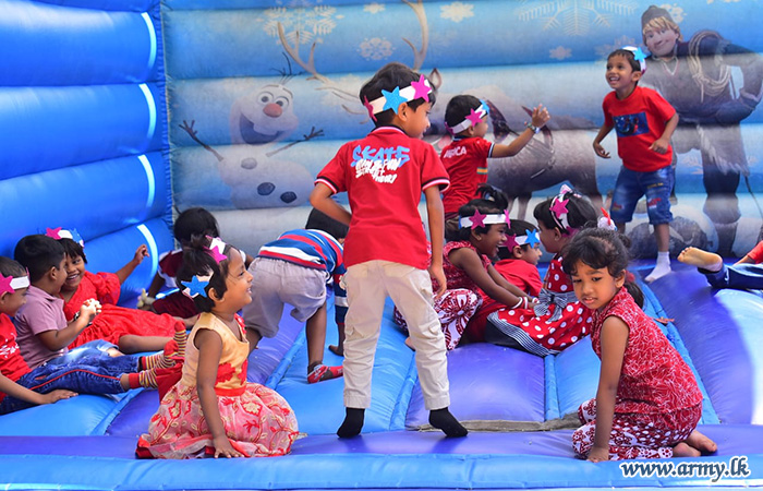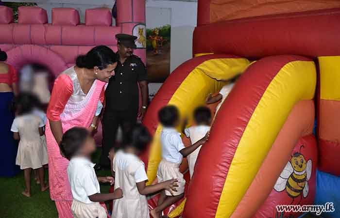 At Pallekele, the event was graced by Major General T.C.M.G.S.T Cooray RWP RSP USP ndc psc, General Officer Commanding, 11 Infantry Division, and Mrs. Dilani Wickramasinghe, Senior member of the Army Seva Vanitha Unit. Children showcased their talents through drawing, singing, dancing, and play in a bouncing castle, concluding with the distribution of gifts.