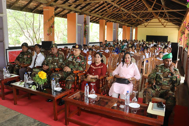 Under the leadership of Major General KAWNH Bandaranayake USP, Commander Security Forces Central and Major General WMNKD Bandara RWP RSP USP ndu psc, Commander 12 Infantry Division and with the supervision of Brigadier MHSP Senaratne RSP, Commander 122 Infantry Brigade conduct book pack distribution ceremony at H/Sithuminiwela Primary School.