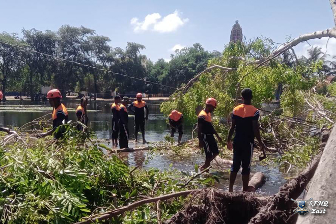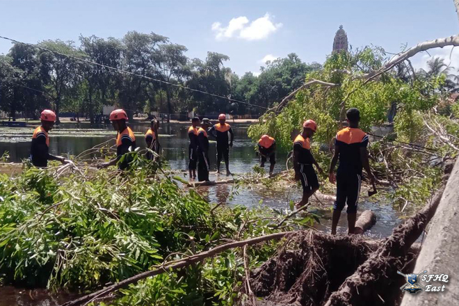 Troops of the 11 (V) Sri Lanka Sinha Regiment, operating under the 243 Infantry Brigade, removed a fallen tree in the Amarthakali area in Batticaloa at 1100 hrs on 05 December 2025. The task was carried out in response to the adverse weather conditions which had caused the tree to fall and obstruct movement in the area. The troops efficiently cleared the obstruction and restored normal access, contributing to the safety and mobility of the local community.