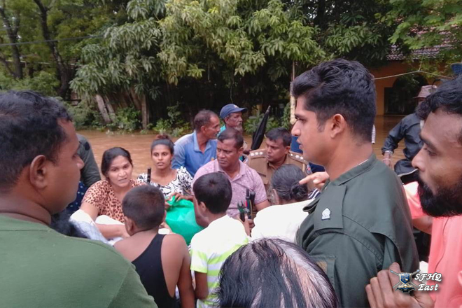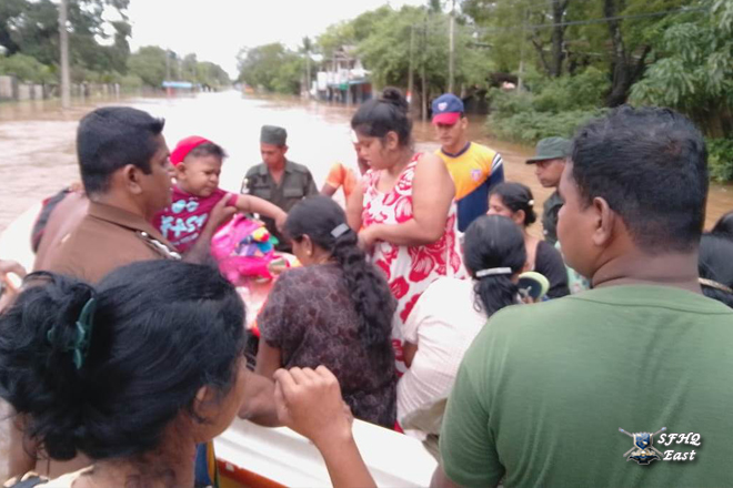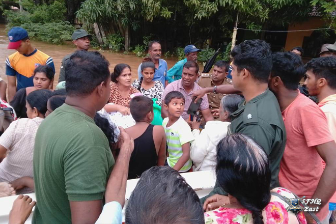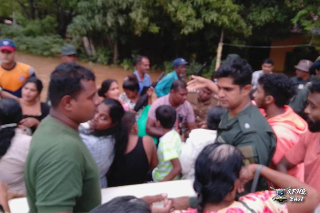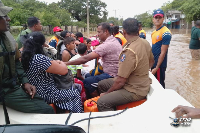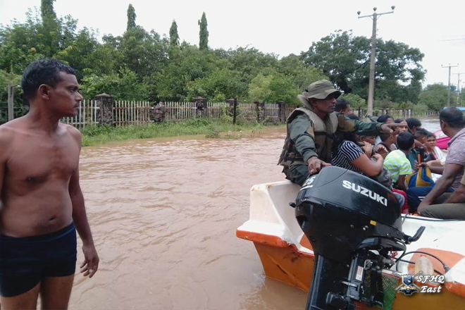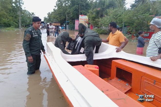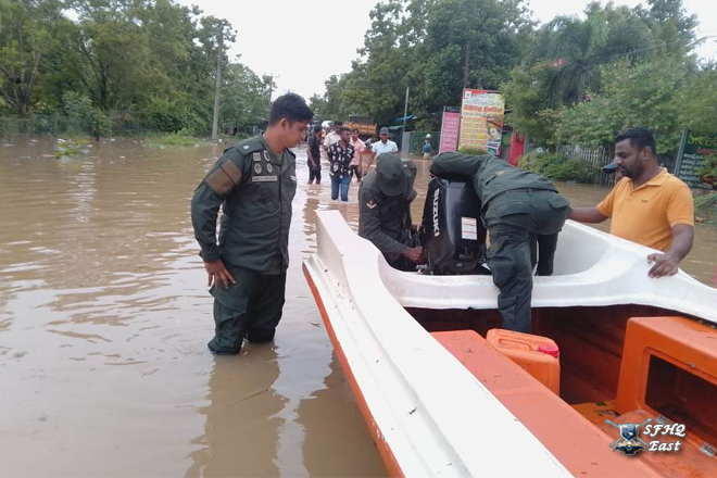 Due to heavy rainfall, a severe flood situation was reported in the General Area Polonnaruwa, particularly in the Polonnaruwa Public Ground area and Puddur villages, which fall under the SFHQ (E) region. As a result, several villagers were affected by the rising floodwaters. Accordingly, a team of 01 × 03 troops from the Boat Team was deployed on 28 November 2025 to rescue the affected Many civilians.