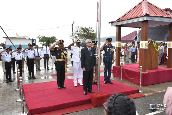 දවසේ වැඩසටහන් සාම්ප්රදායික හමුදා චාරිත්රානුකූලව ආරම්භ විය. ගරු ආණ්ඩුකාරතුමා විසින් මගුල් බෙර නාද මැද ජාතික ධජය එසවීම සිදුකළ අතර, පාසල් සිසුන් විසින් ජාතික ගීය ගායනා කරන ලදී.