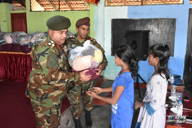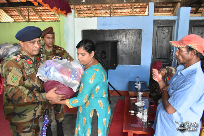 ආරක්ෂක සේනා මුලස්ථානය (නැගෙනහිර) ආඥාපති මේජර් ජෙනරාල් ජේඑස්බීඩබ්ලිව් පල්ලේකුඹුර ආර්ඩබ්ලිව්පී ආර්එස්පී එන්ඩීයු පීඑස්සී ජ්යෙෂ්ඨ නිළධාරිතුමන්ගේ මගපෙන්වීම මත 22 වන පාබල සේනාංක මුලස්ථානයේ සේනාංකාධිපති මේජර් ජෙනරල් එච්ඩීඑල්එස් ලලිත් පෙරේරා ආර්ඩබ්පී ආර්එස්පී යන ජ්යෙෂ්ඨ නිළධාරිතුමන්ගේ උපදෙස් මත 223 වන පාබල බලසේනාවේ බලසේනාධිපති කර්නල් එම්ටීඅයි ගුණවර්ධන ආර්එස්පී පීඑස්සී සහ 15 වන ශ්රිලංකා පාබල හමුදාවේ අණදෙන නිළධාරි ඇතුලු ජ්යෙෂ්ඨ නිලධාරින්ගේ අධීක්ෂණය යටතේ අයහපත් කාළගුණික තත්වය හේතුවෙන් ඉරුදියපුරම් ප්රදේශයේ පිඩාවටපත් පවුල් 250ක් සදහා සුංගාවිල දොම්පේ ශාන්ති විහාරනායක හිමි විසින් ප්රධානය කරන ලද වියලි සලාක මළු සහ අවශ්යතා බෙදා දීමක් 2025.12.18 වන දින ඉරුදියපුරම් ගම්මානයේදී යුද්ධ හමුදා සමාජිකයින් සහ ප්රදේශවාසින්ගේ සහභාගිත්වයෙන් සිදුකරන ලදී.