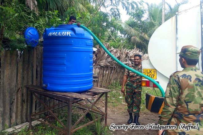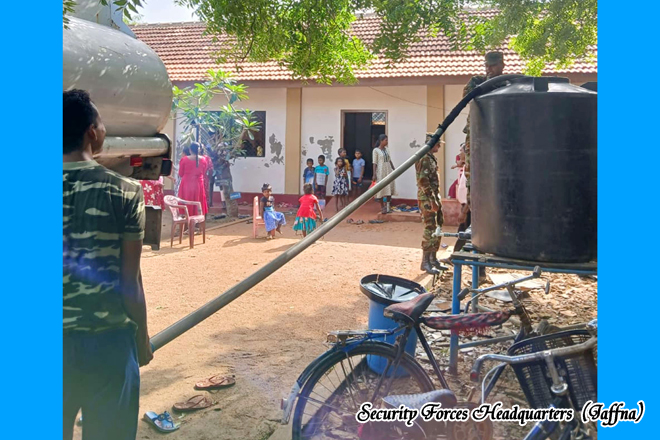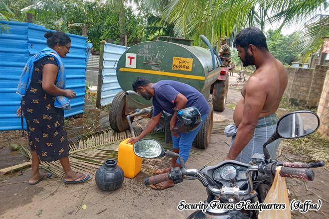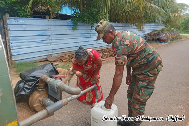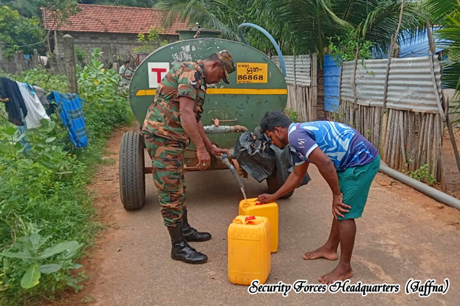 Troops of the 9 (Volunteer) Sri Lanka Light Infantry Regiment, operating under the 511 Infantry Brigade, responded to urgent civilian needs in the Palali North area. Following the accumulation of rainwater in houses located in Antonypuram Village, a water bowser belonging to the battalion distributed clean drinking water to affected civilians. The operation was carried out with the participation of 01 officer and 05 soldiers.