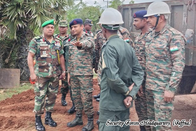 In addition, the Commander of the 55 Infantry Division, Major General Aruna Wijekoon USP ndc, visited the site of the A-35 road bridge at Kandaweli, which had been damaged during the recent severe weather. His visit focused on supervising the ongoing restoration work. During the inspection, he met with representatives and engineers from the Indian Army who are presently involved in constructing the new bridge.