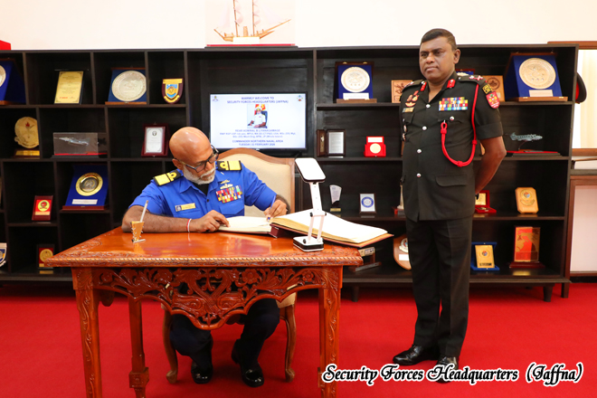 Rear Admiral B Liyanagamage RWP RSP USP ndc psc, MPhil, MA SS (CT:P&S) USA, MSc (DS) Mgt, BSc (DS) Mech Eng, AFNI, JP (Whole Island), the Commander Northern Naval Area, paid a courtesy call on Major General KTP De Silva RSP ndu psc, the Commander Security Forces (Jaffna), on 03 February 2026 at the Security Forces Headquarters, Jaffna. The Rear Admiral was warmly welcomed by the Commander Security Forces (Jaffna), and the meeting was held in a cordial and professional setting.