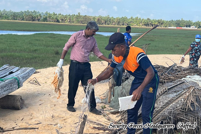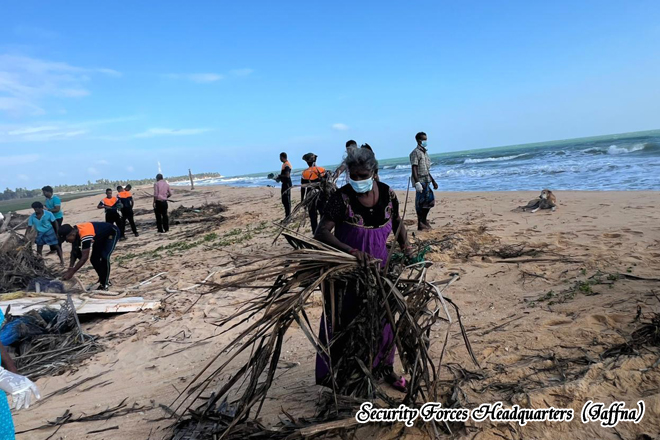 4 Sri Lanka Singha Regiment troops with the Divisional Secretariat personnel cleaned the Katkovalam beach area of fish market and distributed milk packets.