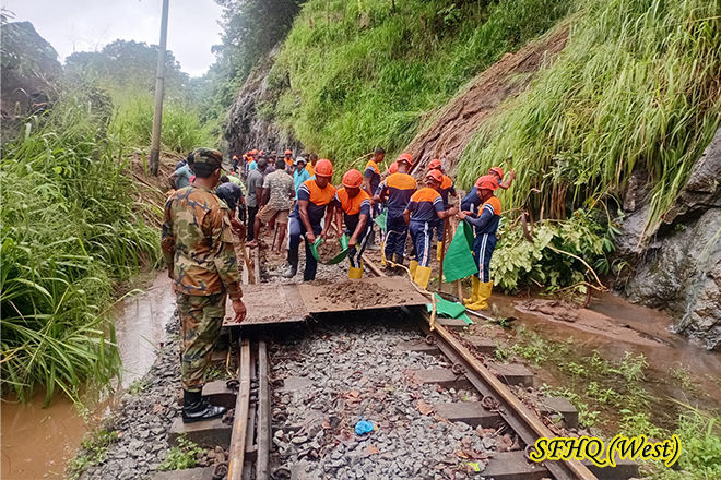 A train traveling from Kandy to Colombo was derailed near Mawanella around 1650 hours on 19 October 2025 due to a landslide in the area. Responding promptly to the situation, three teams comprising 48 troops from the 8th Battalion Sri Lanka Sinha Regiment (8 SLSR), under the 611 Infantry Brigade of the 57 Infantry Division, were deployed from their camp at 1900 hours to provide assistance. The troops supported the authorities in clearing the track and ensuring the safety of passengers and railway staff affected by the incident. Their timely response and dedicated effort helped to stabilize the situation and restore normalcy in the area. After completing the assigned duties, the troops returned to their camp at 2130 hours on the same day. This operation once again reflects the Sri Lanka Army’s commitment to serving the nation in times of need.