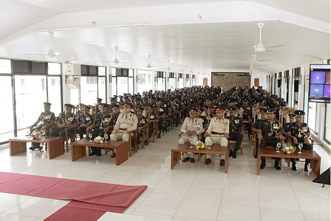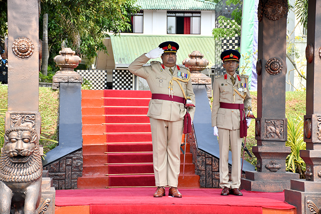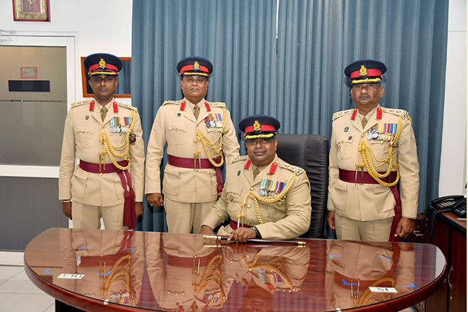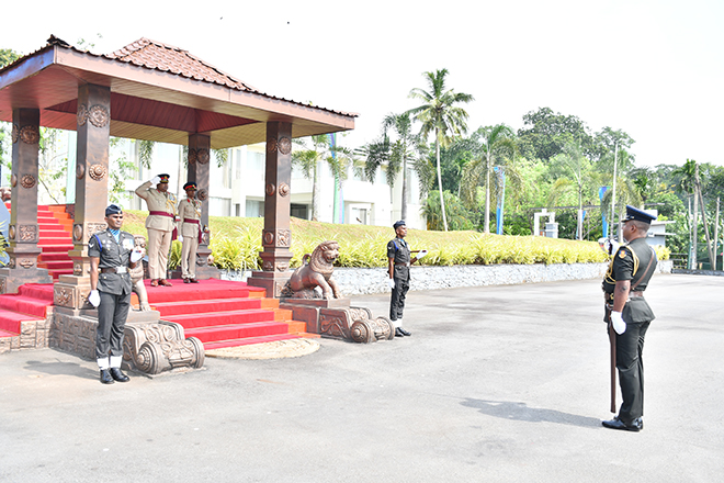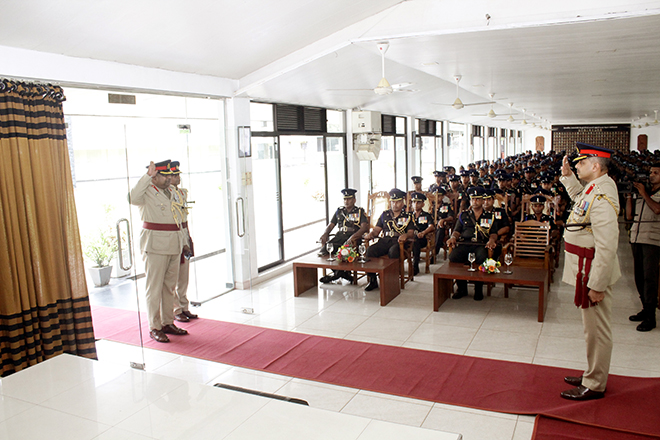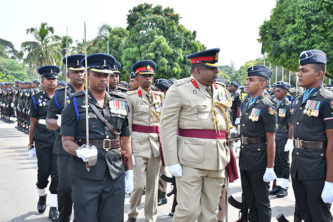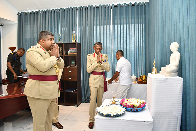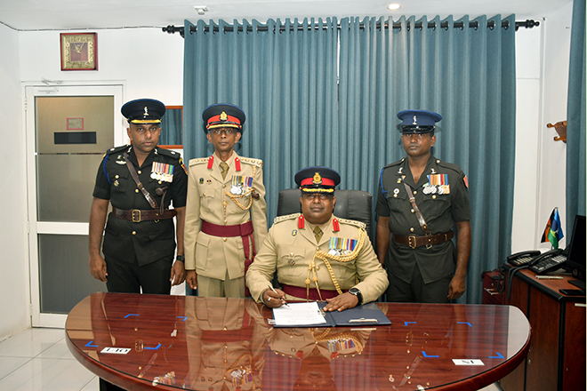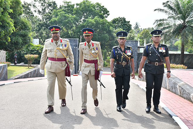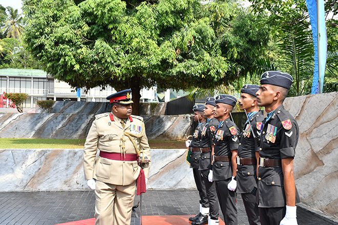 Later, the Parade Commander invited the day's protagonist to review the Ceremonial Parade, accorded in his honour and receive the salute from the special dais. Next, the newly appointed Centre Commandant symbolically placed his signature on an official document to mark the assuming of duties, amidst religious observances at his office. Subsequently, setting out his scope of work and duties, Brigadier Champika Wijekoon addressed troops serving in the Regimental Center and insisted them to work through patriotism, discipline, loyalty, honest, respect and knowledge. After posing a group photograph with the Regimental Centre Staff to add much more memories to the day, the senior officer attended an all ranks' tea at the Corporals' Club, where he made a brief interaction with the participants.
