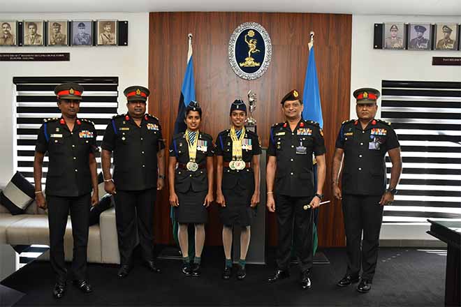 The Regimental Headquarters of the Sri Lanka Signal Corps was filled with pride and celebration as the corps paid tribute to two of its exceptional athletes this morning, the Colonel Commandant of the Corps welcomed and honoured two of its outstanding athletes, Lance Corporal M Y F Safiya and Lance Corporal D T A De Silva for their outstanding achievements at the 4th south Asian Senior Athletics Championship 2025 held in Ranchi, India. Their stellar performances, which brought international recognition and glory to both the Sri Lanka Army and the nation, were honoured in a grand felicitation ceremony graced by the Colonel commandant of the Sri Lanka Signal Corps.