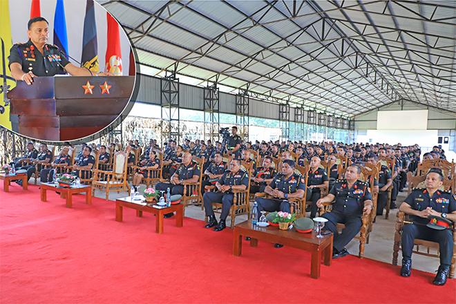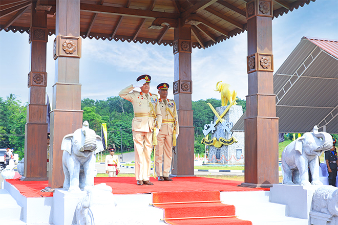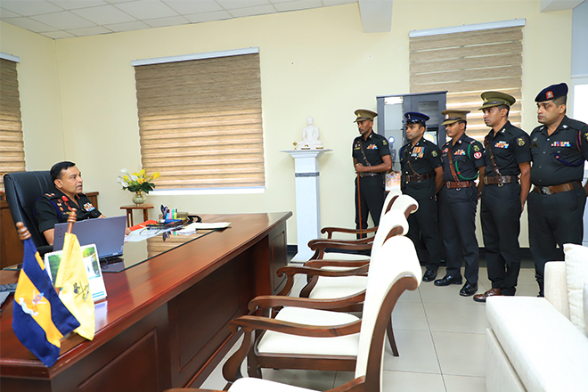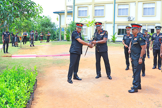 Customary formalities observed in connection with the relinquishment of the office, commenced with the reviewing of the Guard Turnout accorded to the outgoing Commandant on his arrival to the camp premises. Major General Kapila Dolage was warmly received by Major General B M R J Bandara - the Deputy Commandant, along with the Principal Staff Officer SLAVF, Centre Commandant of the Sri Lanka National Guard and the Commanding Officer of the Headquarters Battalion, and the ceremonial proceedings began with the reviewing of a Guard Turnout salutation.