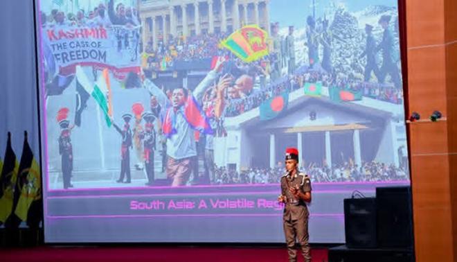 On 20 December 2025, the passing-out Officer Cadets delivered a well-researched presentation on “Hybrid Warfare in the Digital Age: the Role of Artificial Intelligence in Modern Military Strategy” to an audience of military and civilian intellectuals. The event was graced by the Deputy Minister of Defence, Major General KP Aruna Jayasekara (Retd) WWV RSP VSV USP ndc psc as the Chief Guest, alongside the Commander of the Army, Lieutenant General Lashantha Rodrigo RSP ctf-ndu psc IG, the Vice Chancellor of the Sir John Kotelawela Defence University, the Chief of Staff, Inspector General of Police, former Commanders of the Army and Commandants of the SLMA, Senior Officers, Defence Attachés, and other distinguished guests. Following the presentation and views & comments session, the Chief Guest commended the final-term officer cadets for their high academic standards, validity of the research in the contemporary world and their presentation skills. The event also featured the e-launch of the 7th consecutive volume of the SLMA Journal, with copies distributed among the distinguished guests.
