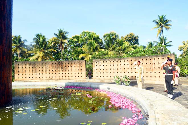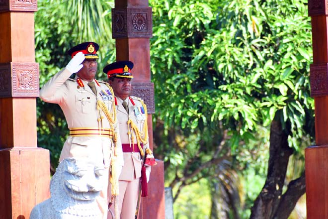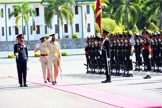 As the first segment of the ceremony, Major General Janith Bandara was warmly received upon his arrival at the Regimental Centre and was accorded a Guard Turnout at the main entrance in accordance with military formalities and then he paid floral tributes to the fallen Vijayabahu War Heroes at the War Heroes Monument` and PWV Monument. Simultaneously, Major General Janith Bandara accepted the regimental salute at the ceremonial Guard of Honour accorded inclusive of Regimental Colours at the regimental parade ground.