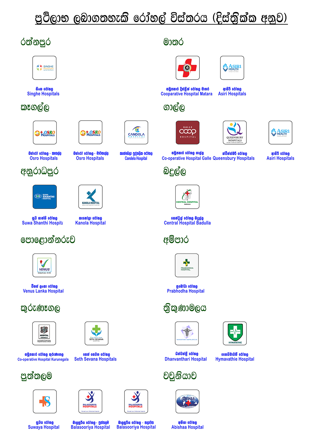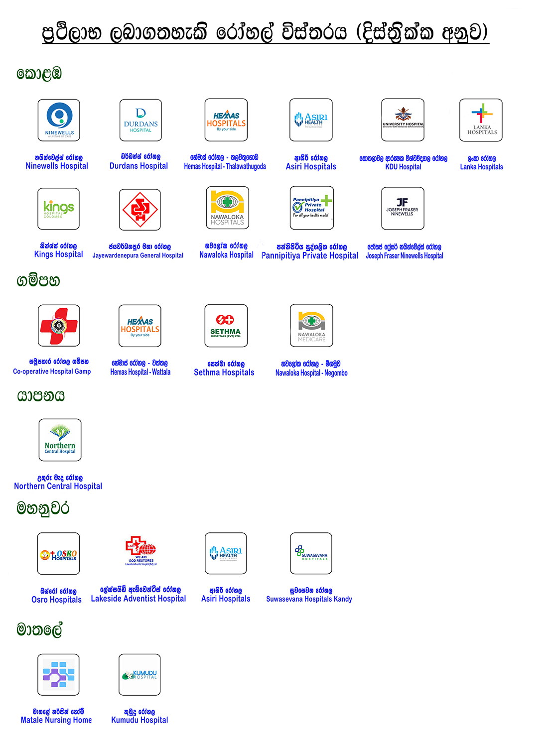 - බරපතළ රෝග කාණ්ඩය යටතේ රෝහල්ගත වීමකින් තොරව බාහිරින් මිලදී ගන්නා ඖෂධ, ශල්ය වෛද්ය උපකරණ, සැරහුම් ද්රව්ය, වෛද්ය පරීක්ෂණ, වෛද්ය හමු (Channeling) හා ඖෂධ (Drugs) බිල්පත් වෙනුවෙන් වැයවන මුදල බරපතල රෝග කාණ්ඩය යටතේ හිමිකම් ඇති රු.1,500,000.00 මුදලට යටත්ව ප්රතිපුර්ණය කිරීමට හැකියාව ඇත.
